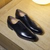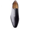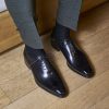 The One Cut Richelieu shoe, five eyelets, flowered toe, black leather. This model benefits from a harmonious and modern line. The leather of VASCO shoes comes from Italian tanneries renowned for the quality and suppleness of their leathers. Traditional Blake stitching under engraving, patina done entirely by hand.