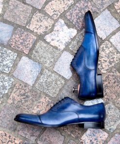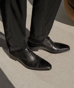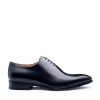 The One Cut Richelieu shoe, five eyelets, flowered toe, black leather. This model benefits from a harmonious and modern line. The leather of VASCO shoes comes from Italian tanneries renowned for the quality and suppleness of their leathers. Traditional Blake stitching under engraving, patina done entirely by hand.