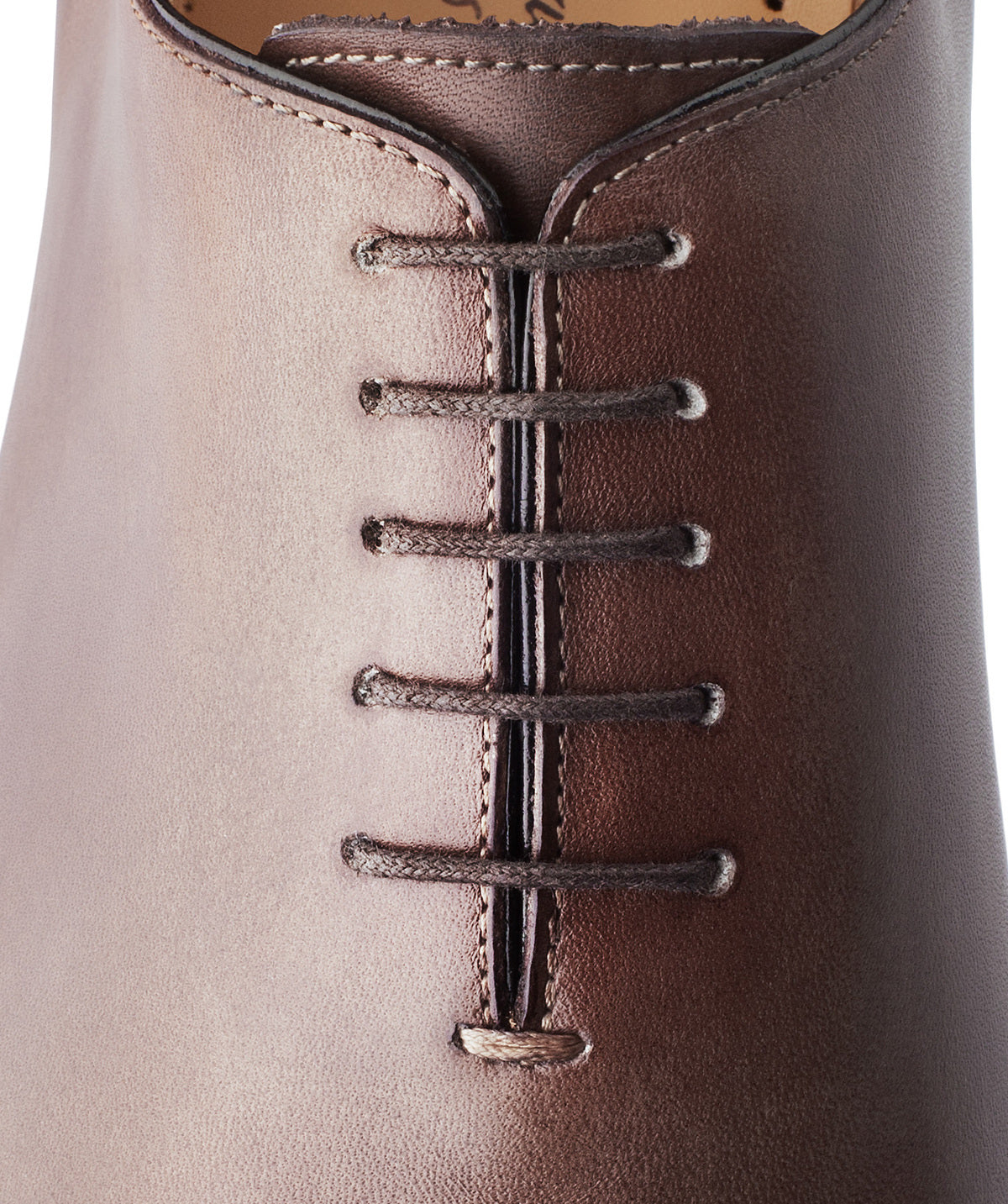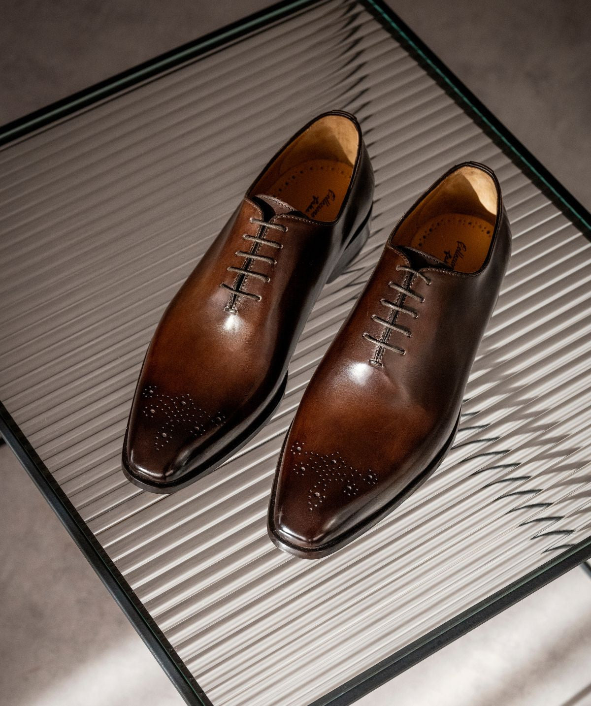 The One Cut Richelieu shoe, five eyelets, flowered toe, patinated chestnut leather. This model benefits from a harmonious and modern line. The leather of VASCO shoes comes from Italian tanneries renowned for the quality and suppleness of their leathers. Traditional Blake stitched assembly under engraving, patina done entirely by hand.